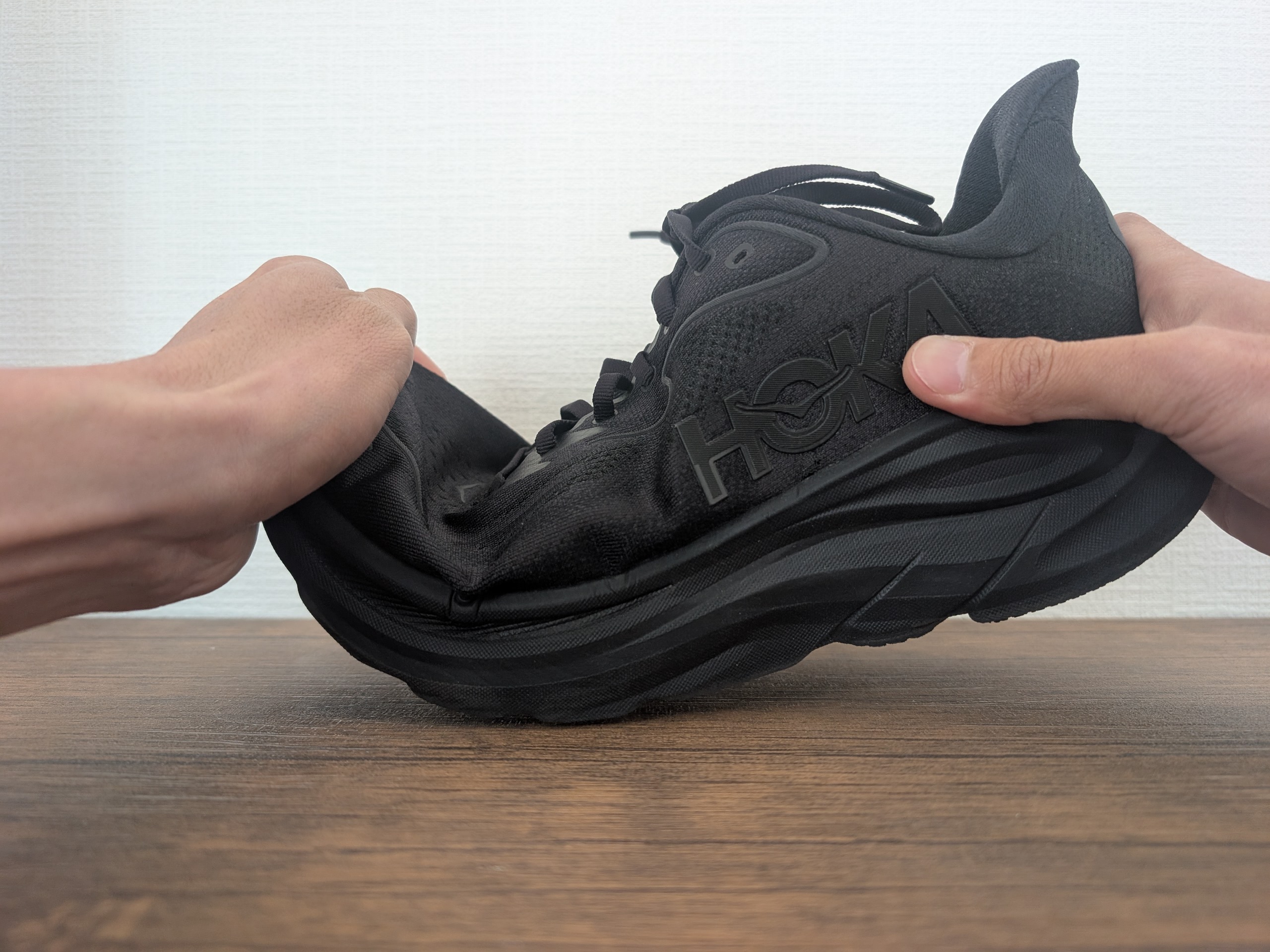 ボンダイ9も柔らかいクッション性ではあるんだけど、踵からつま先までクッション性が分厚いためクリフトンほど曲がらない結果に。