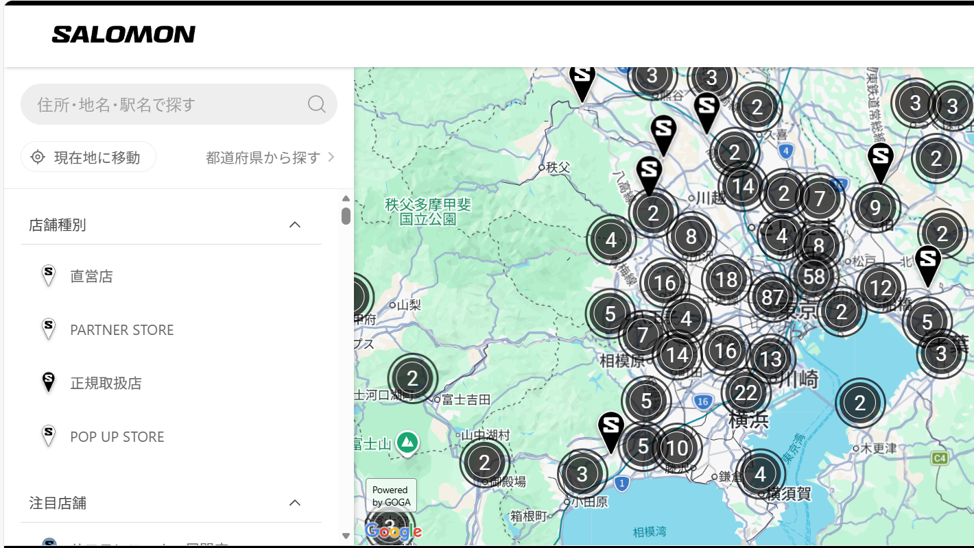 サロモン公式オンラインストアにアクセスしトップページ下部にある「店舗検索」へ進めば簡単に見つけられる。