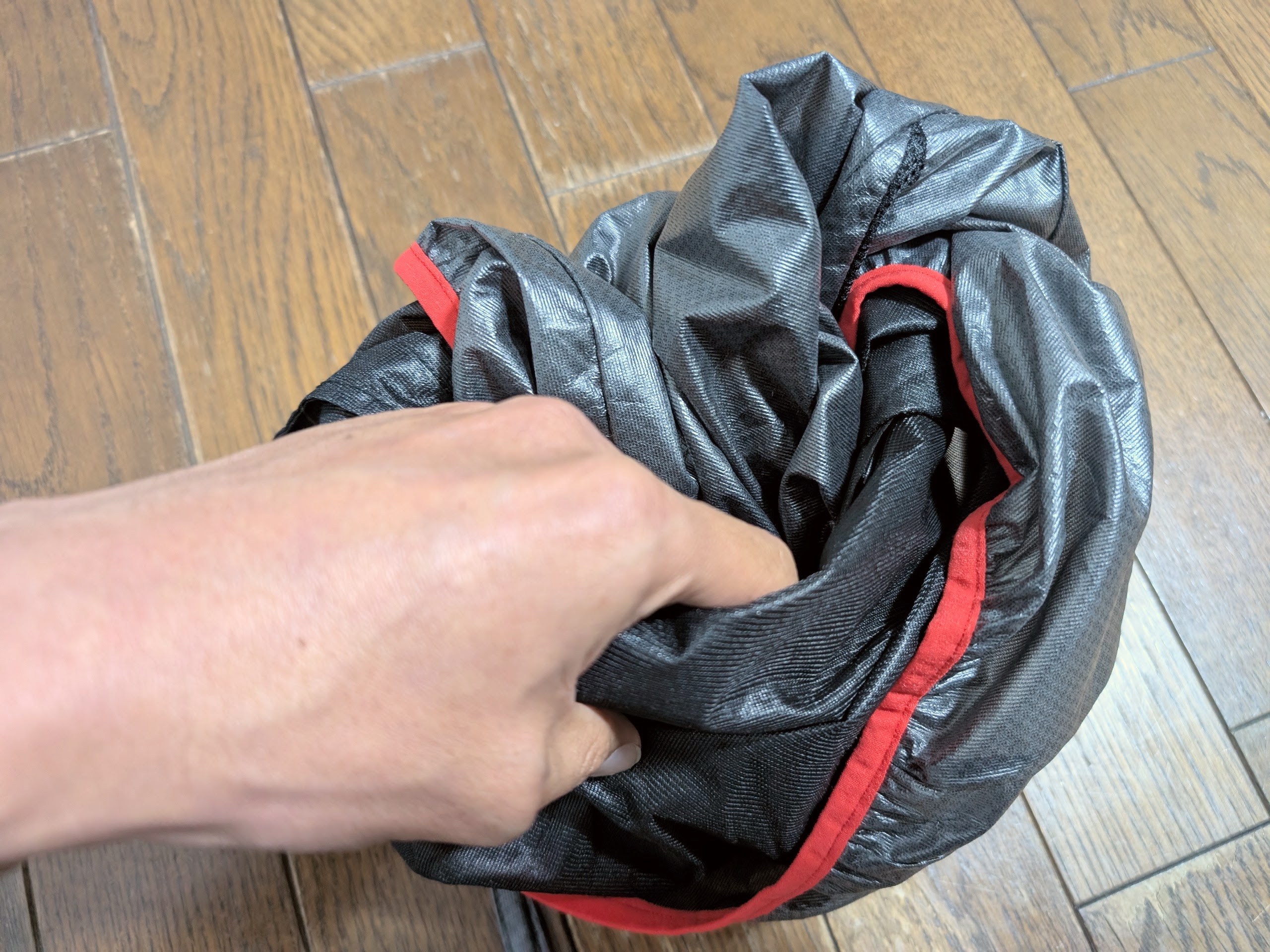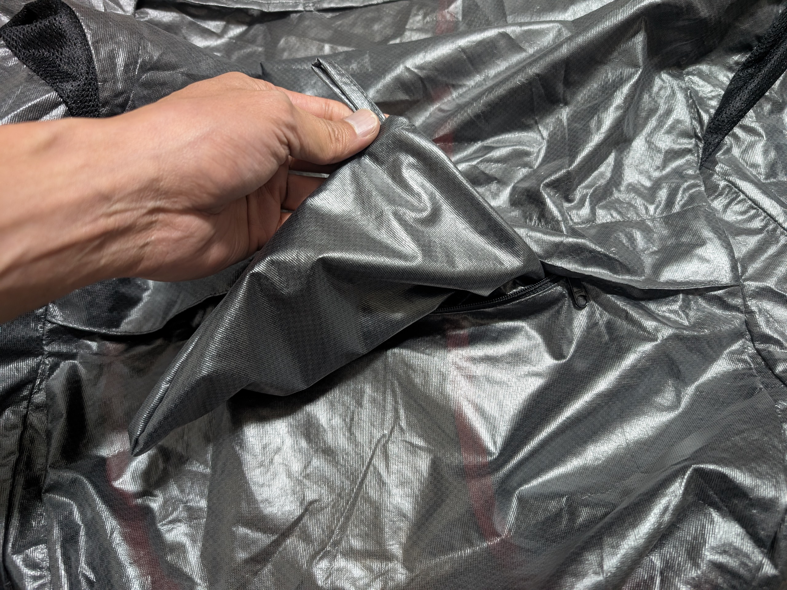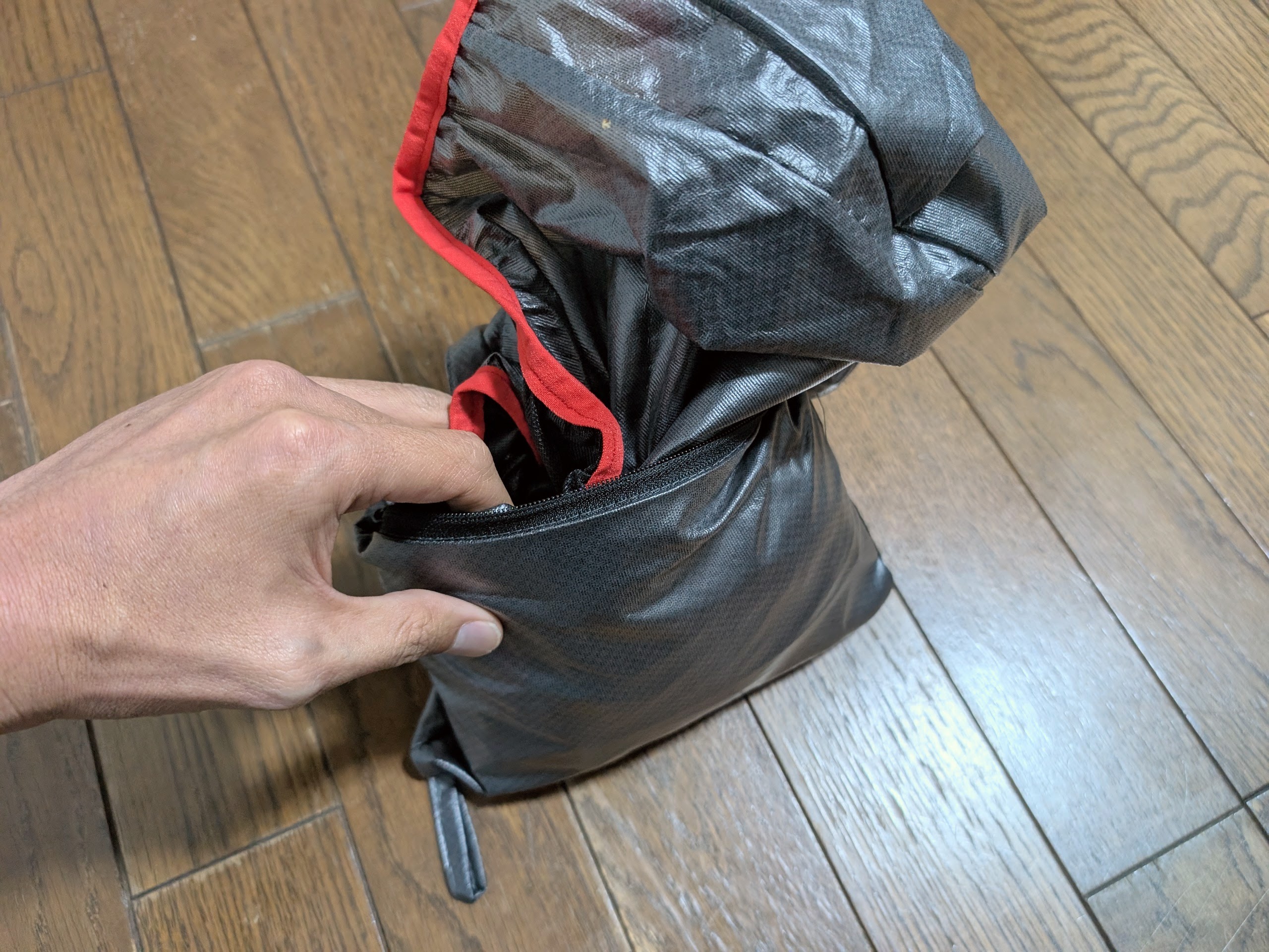ファスナーを開けると中を裏返すように生地を引っ張ってくることで折り畳んだ後の外観の生地が出てくる。