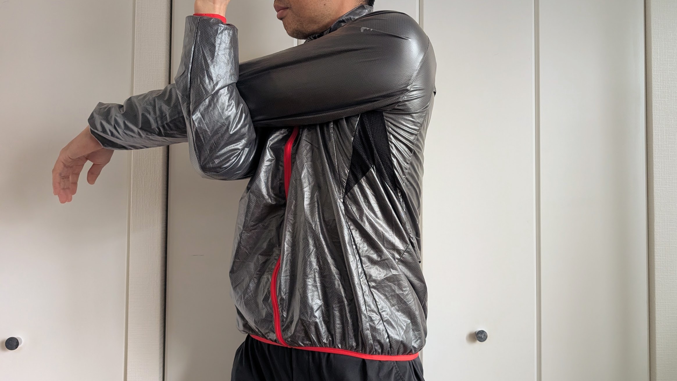 ウインドブレーカー自体に伸縮性は無いものの、ゆったりした着心地なので運動前のストレッチも可能である。