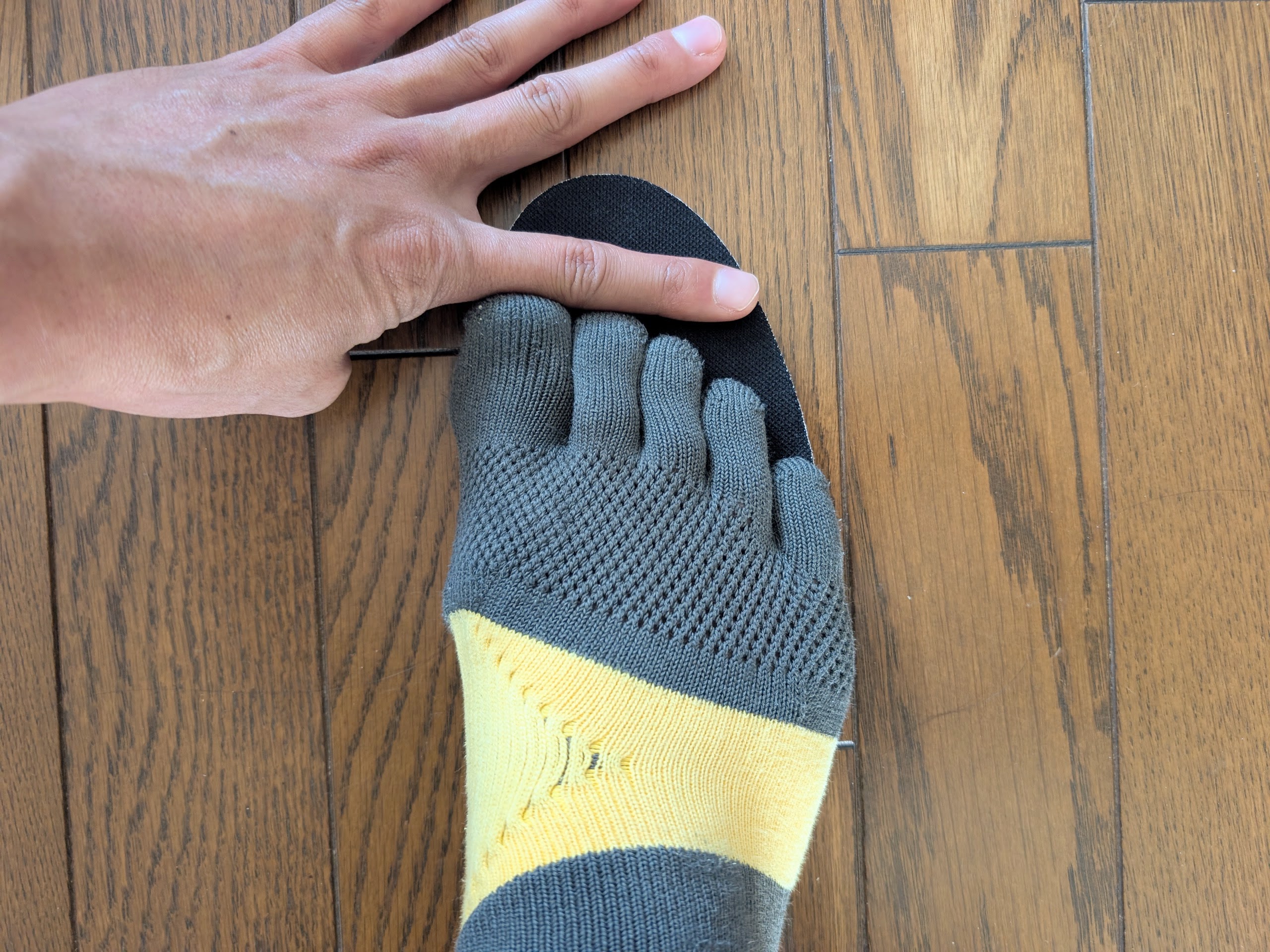 まずはじめにボンダイ9のインソールを取り出して自分の足を乗せた状態でつま先のスペースと幅のサイズが適切かどうかをチェックしてみた。