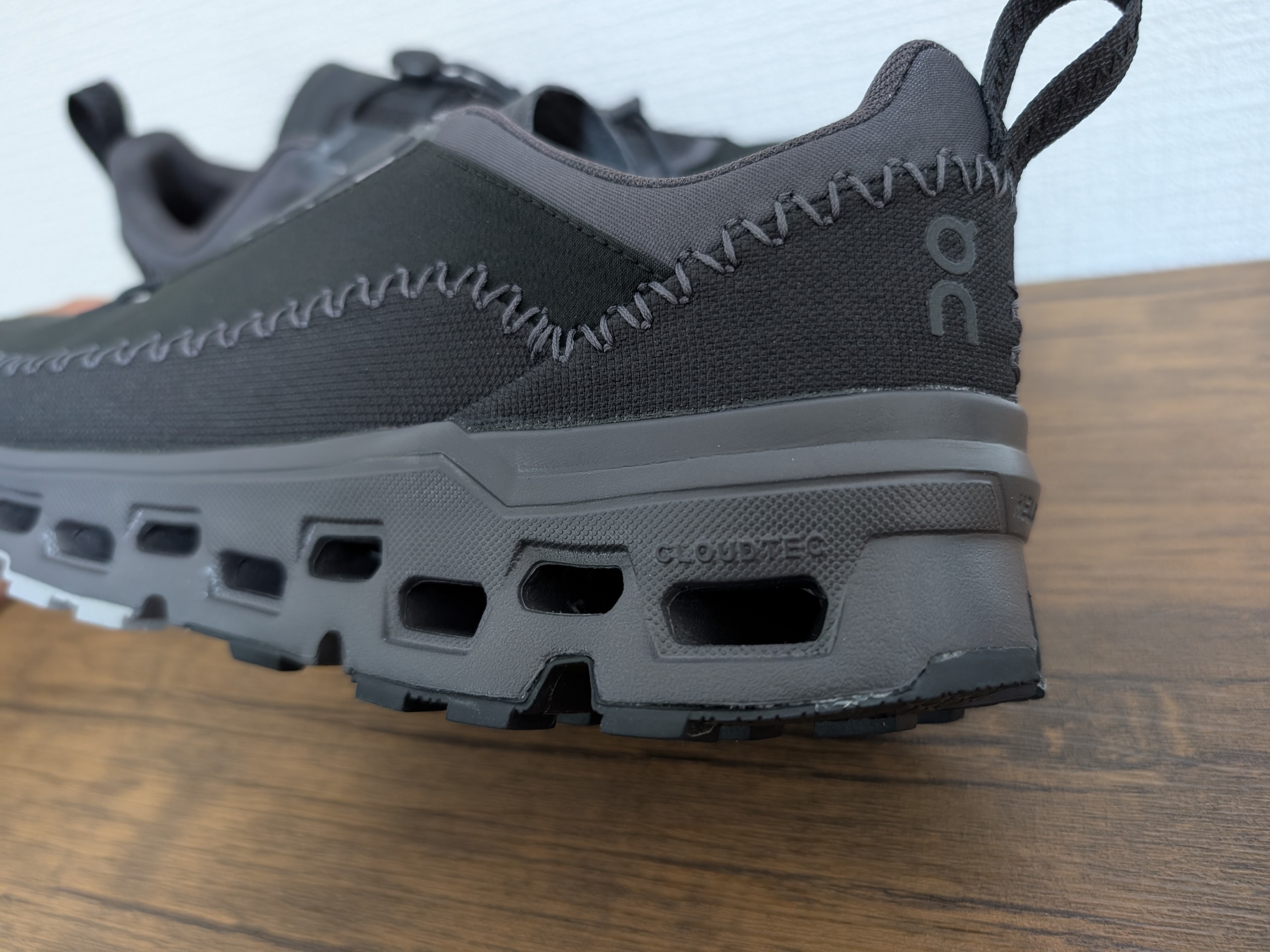 ソールにはきちんとクラウドテックが採用されており、かかと部分もアッパーとミッドソールが強めに縫合されているので浸水しにくい仕様となっている。