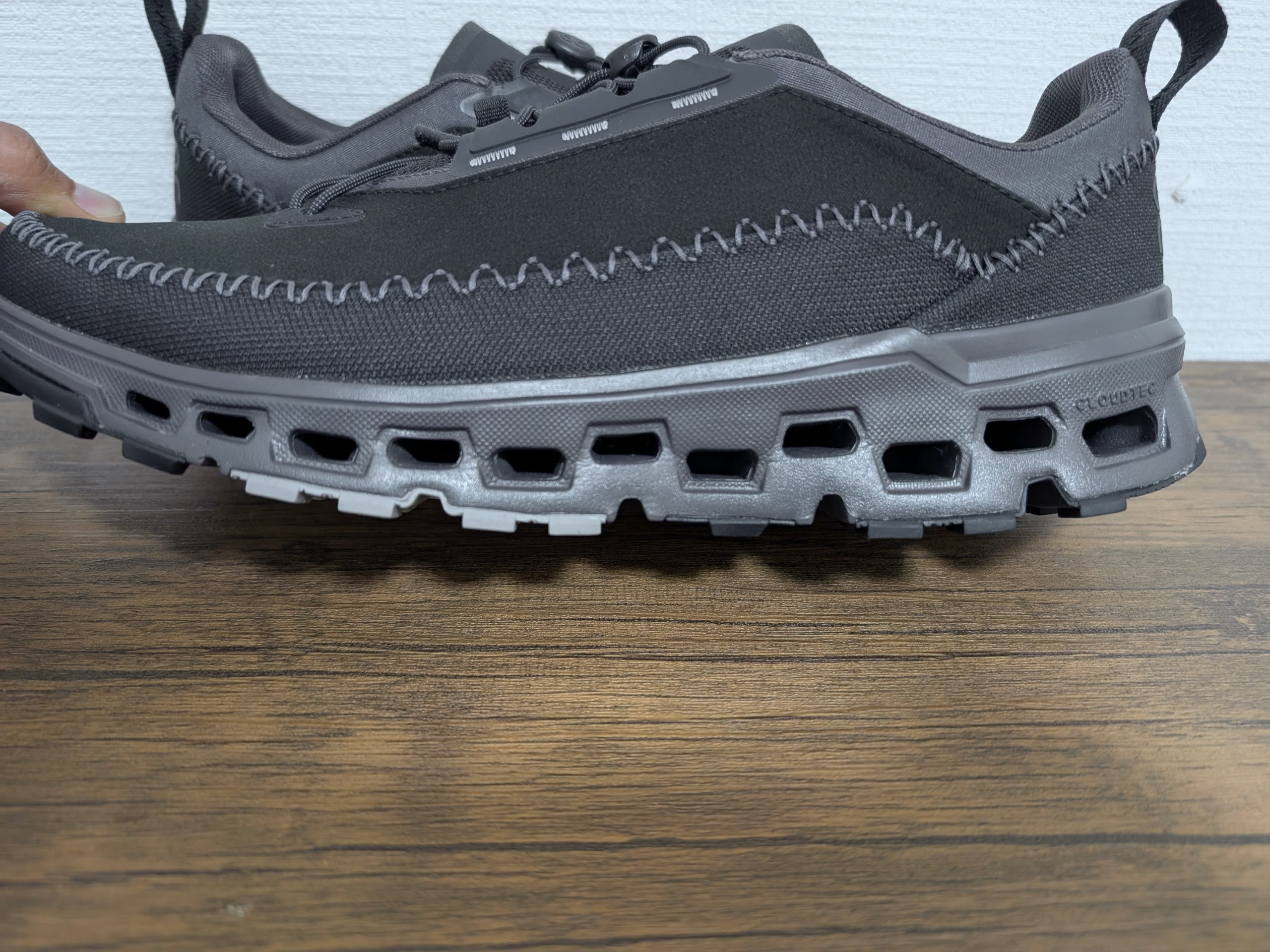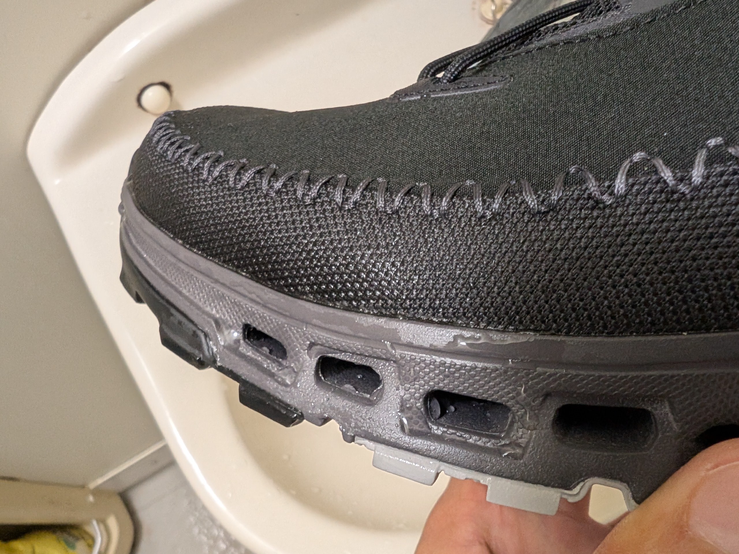 なぜなら、クラウドアウェイ2のアッパーにはメッシュのように穴がなく、ミッドソールと強めに縫合されているからだ。