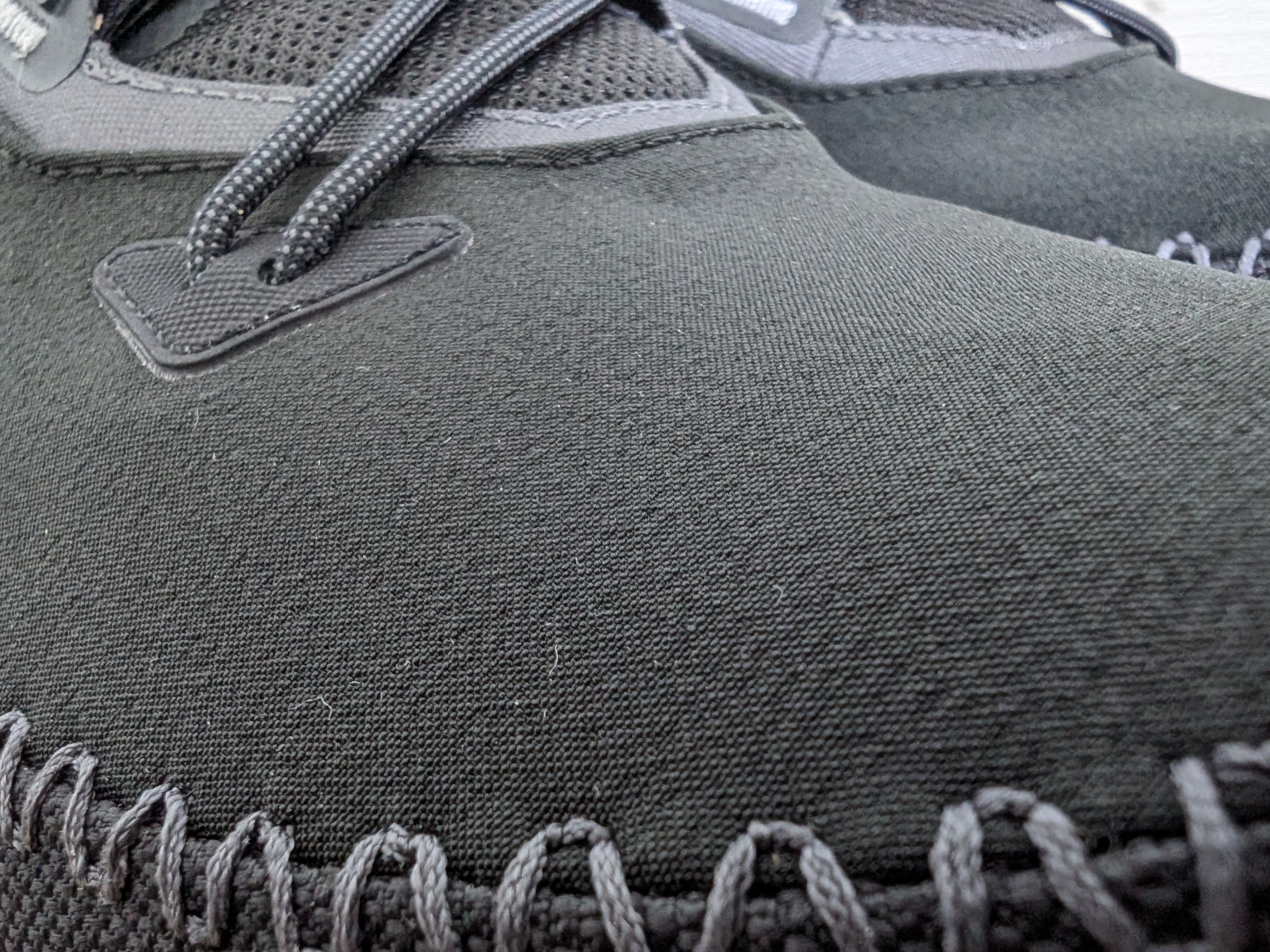 完全防水ではないものの、つま先から浸水をさせないためにアッパーとミッドソールが強めに縫合されているのが見てわかる。
