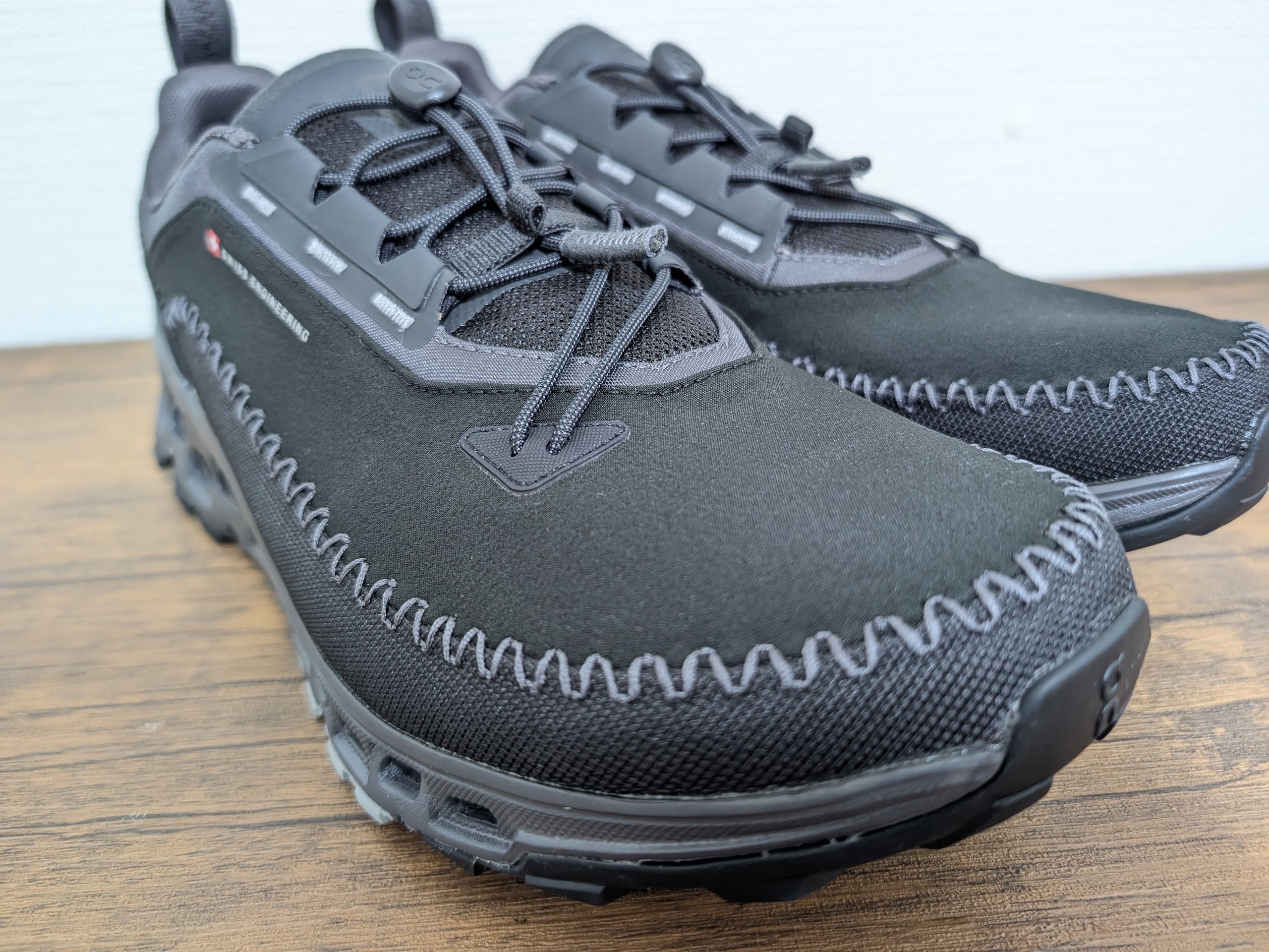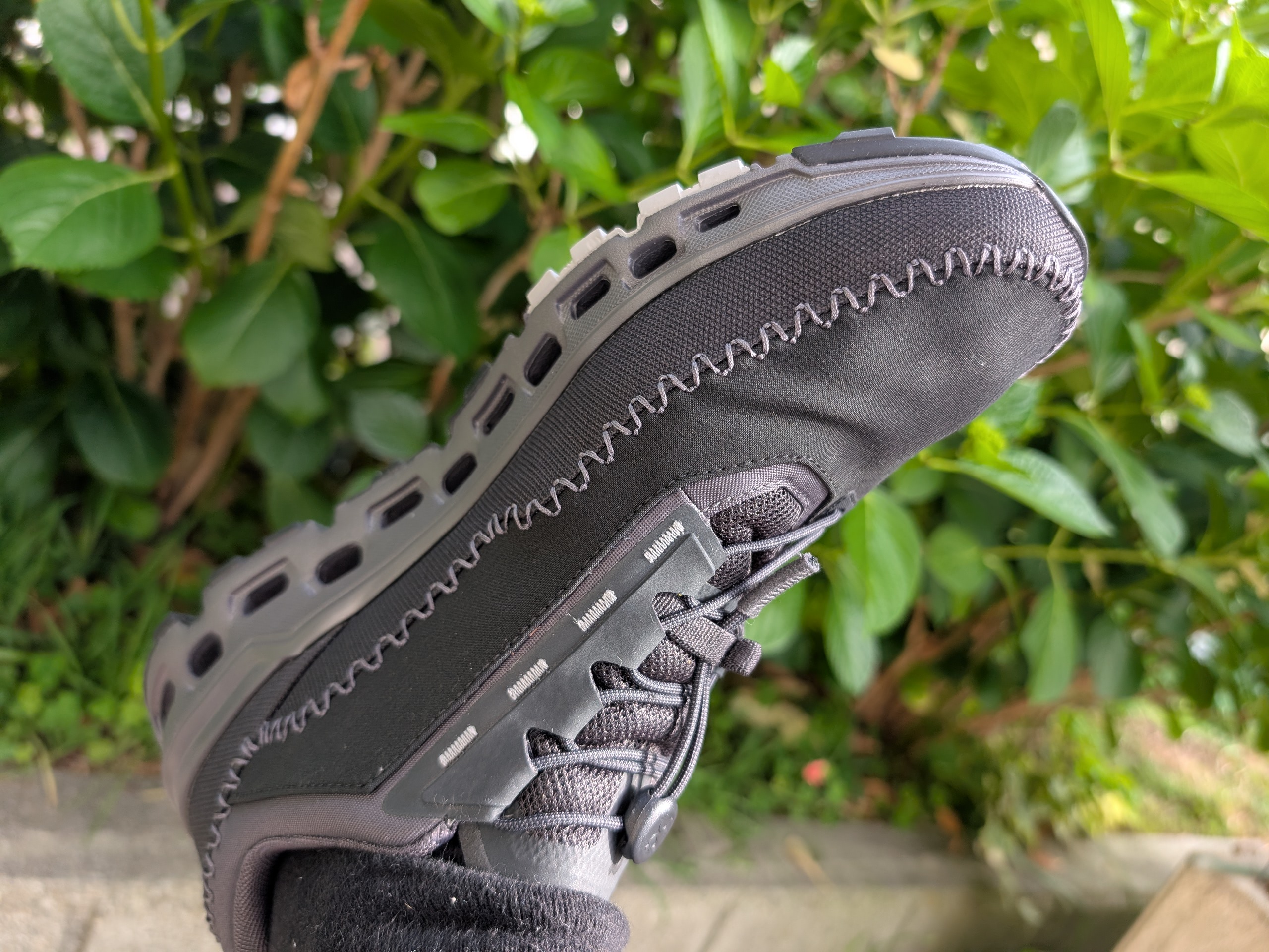 クラウドアウェイの全体的なデザインは、ゴムのシューレースに撥水加工されたアッパーに山で遊べる仕様が満載。