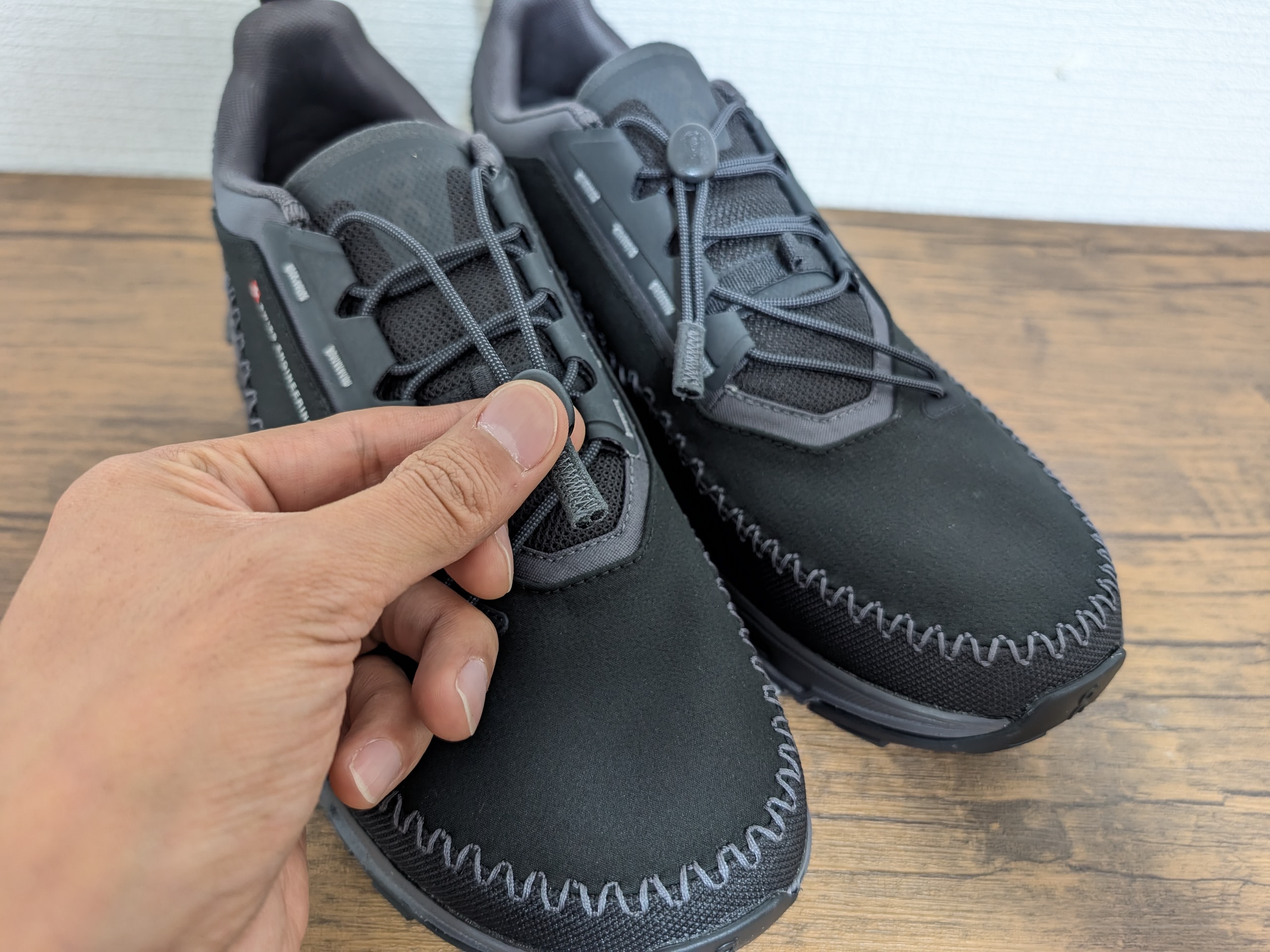 シューレースはゴムの素材なので収縮しやすく、さらにトグルを押して引っ張ることで長さを調節できる。