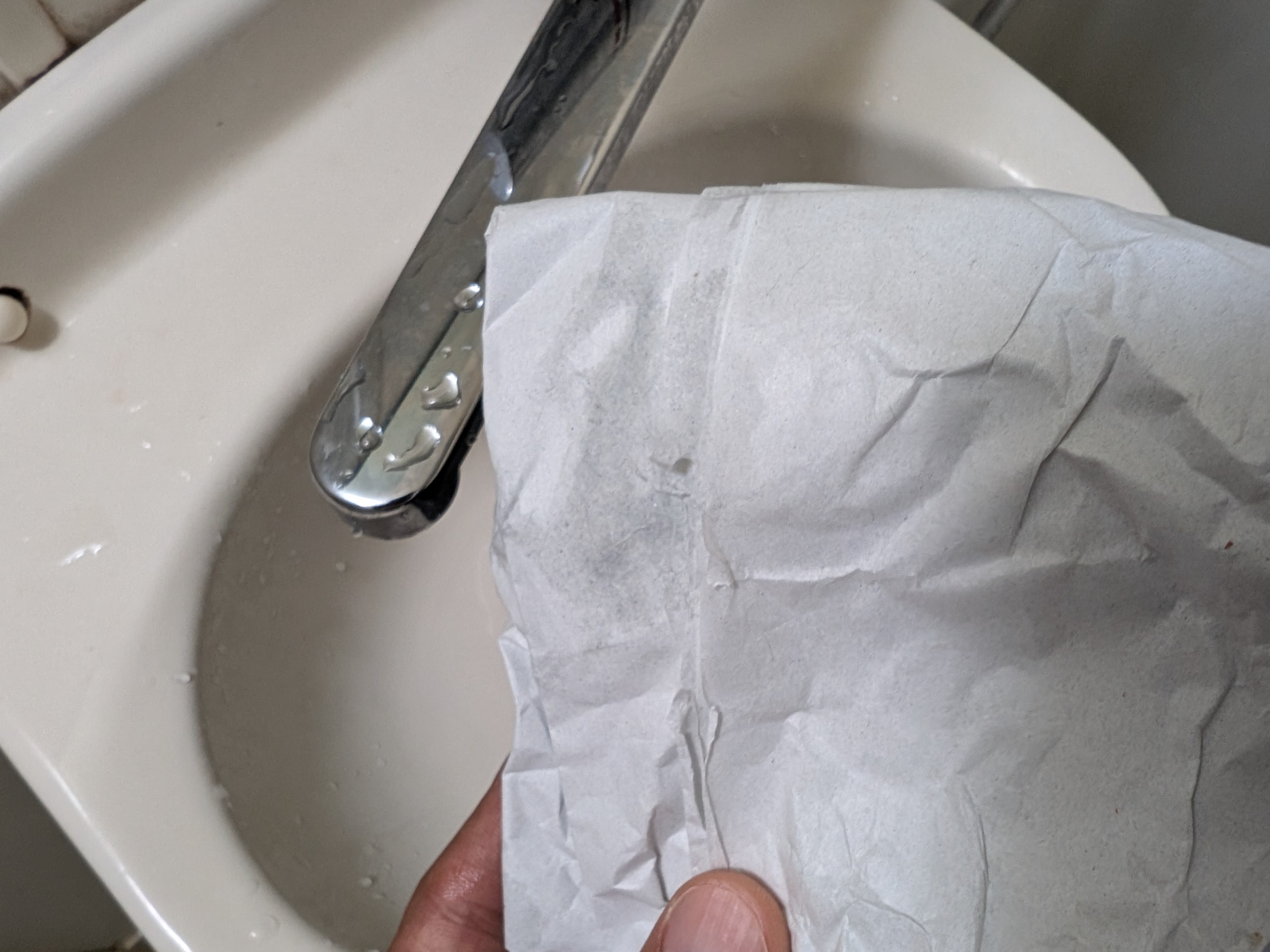 型崩れ防止の紙を入れて検証したところ、先ほどまとめた浸水ポイントが濡れていたことが確認できた。