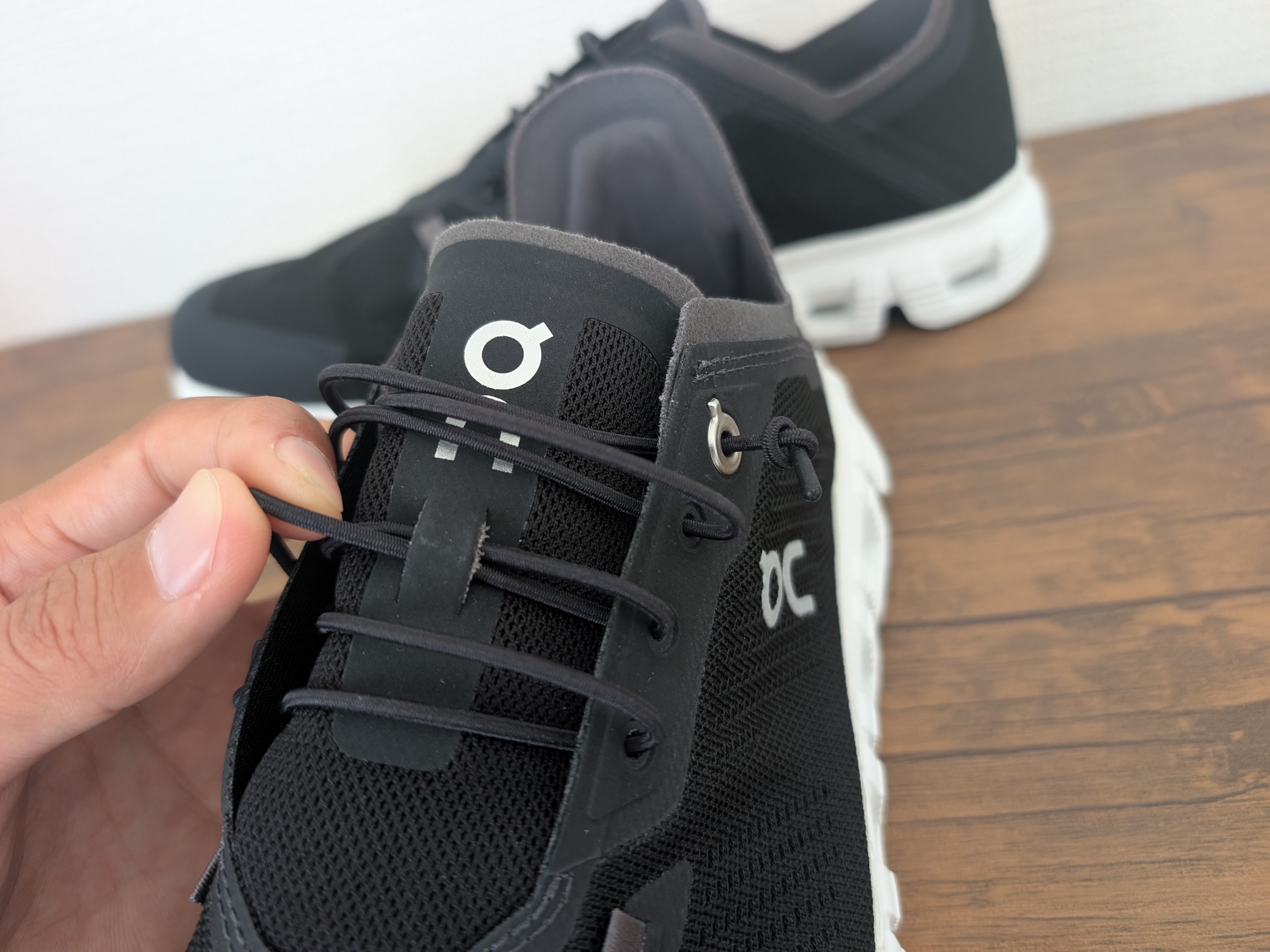 あえて踵を踏めるようにしたシューズはゴム製スピードシューレースを採用。