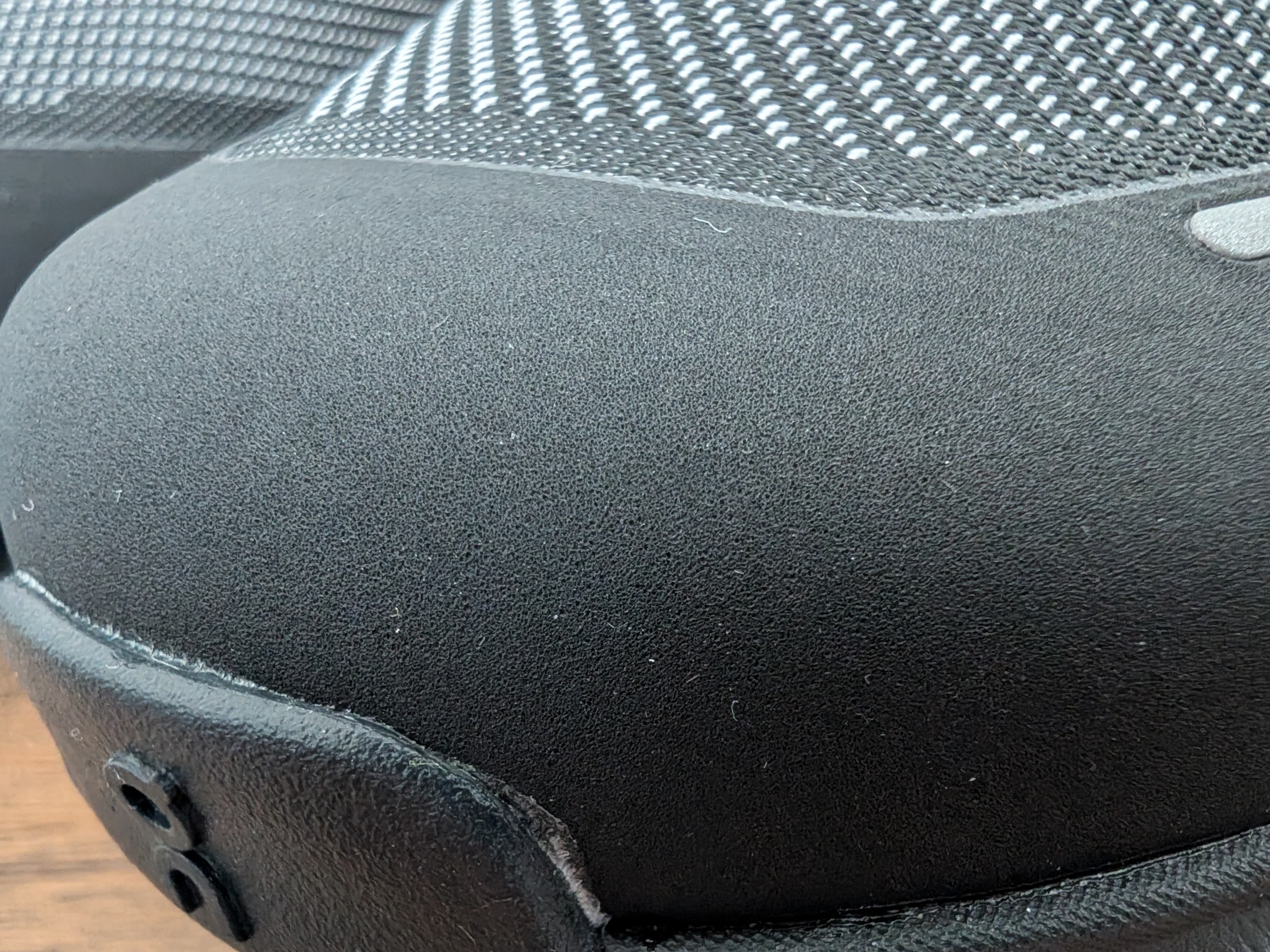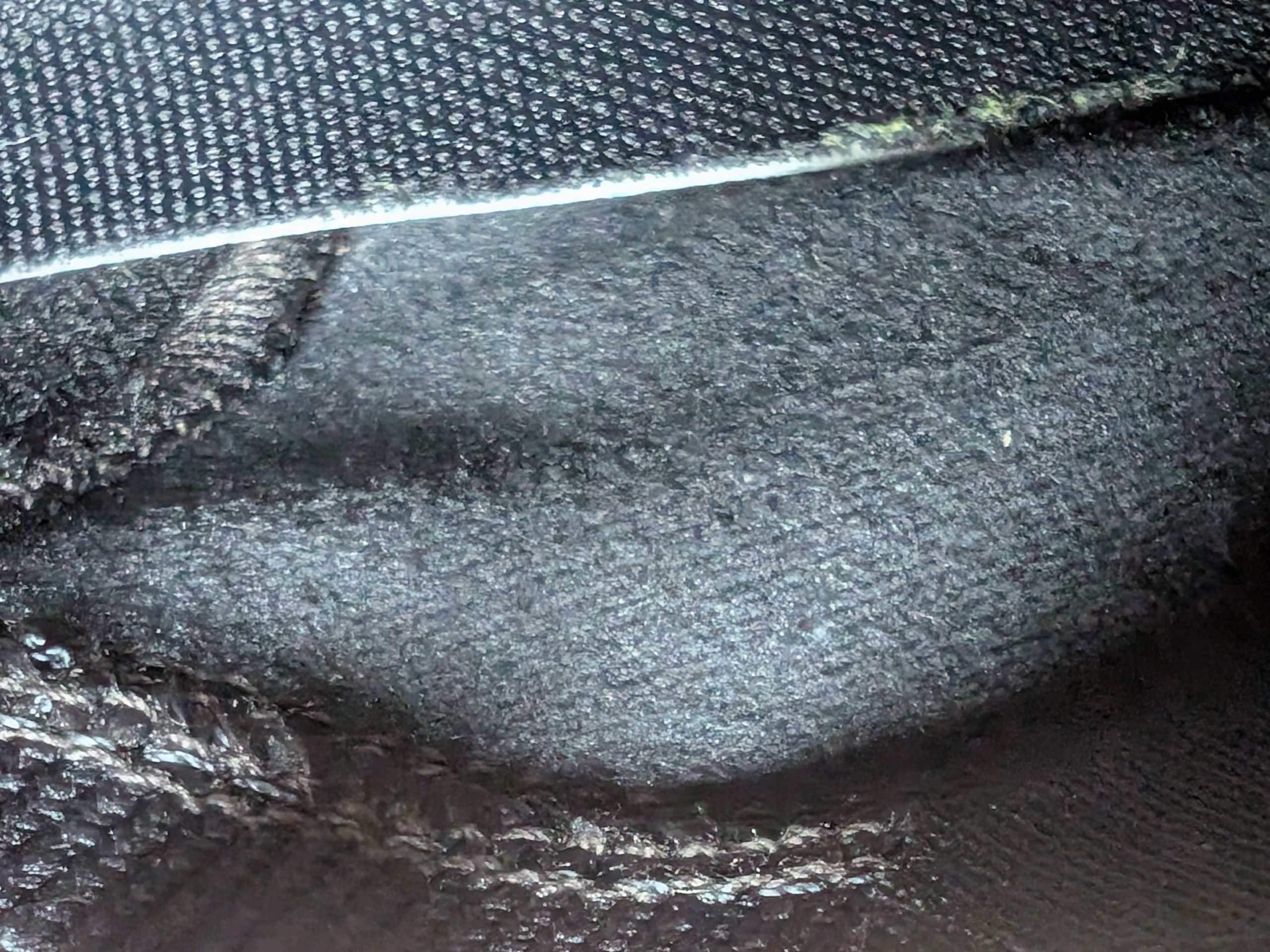 拡大するとこんな感じだけど、この固いパーツの質感は意外にもサラッとしててスウェード生地に近い。
