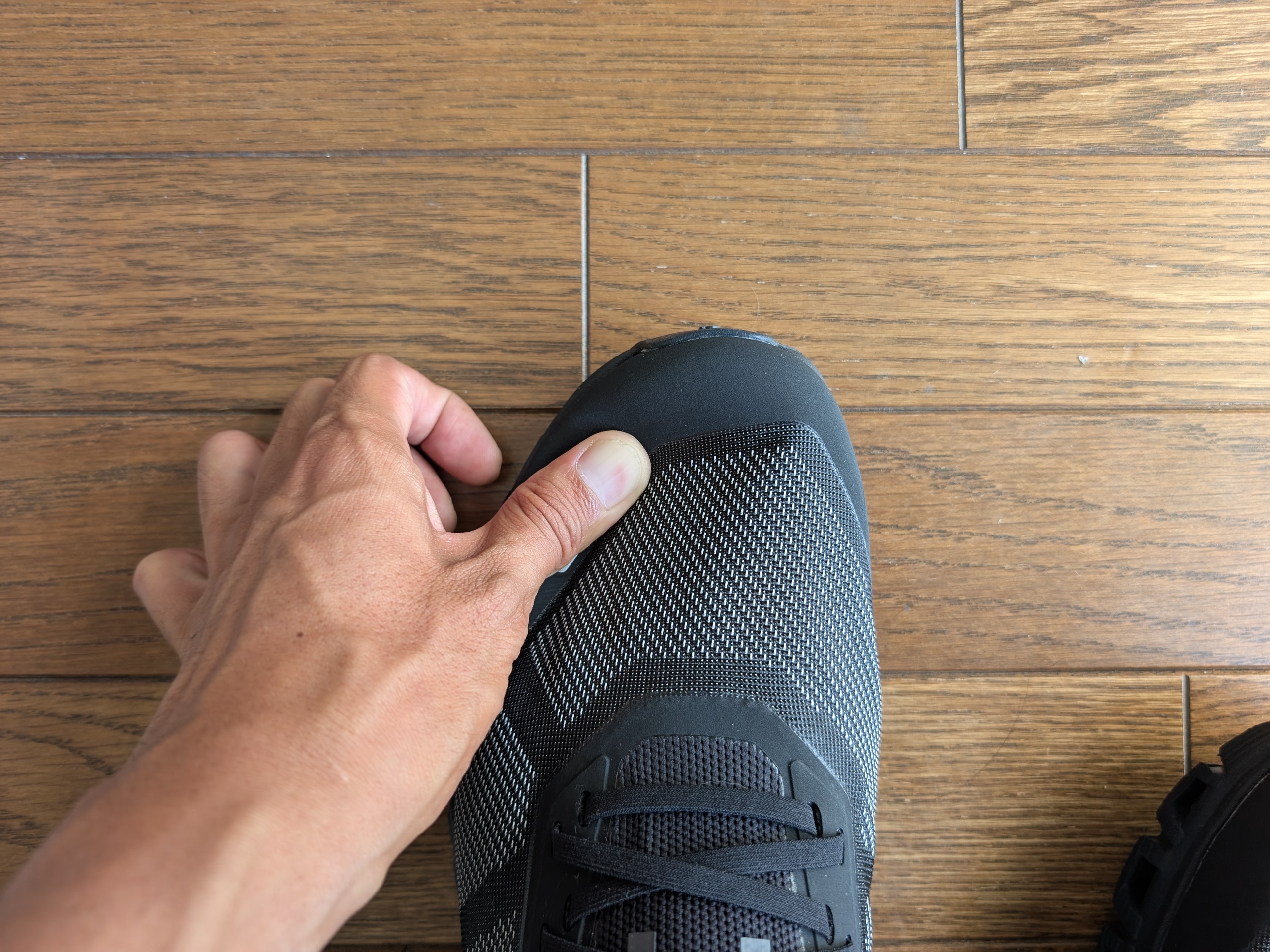リサイクルポリエステルを使用したアッパー素材に対して、つま先には別で固いパーツで覆われているのが特徴的。