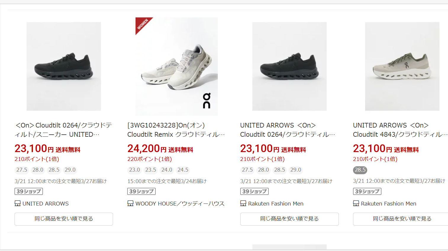 あと楽天でも様々なセレクトショップやシューズ専門店がクラウドティルトを販売していることもある(下記画像を参照)。